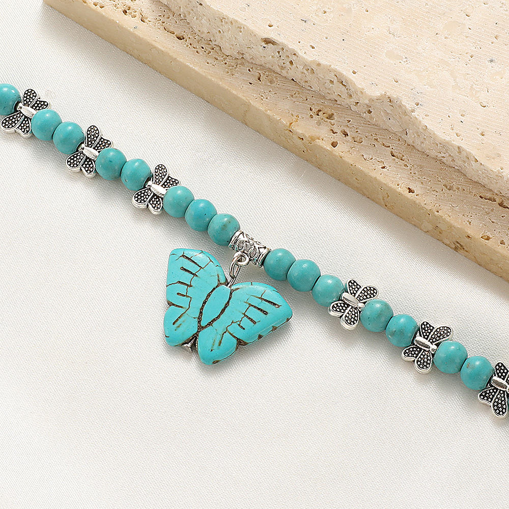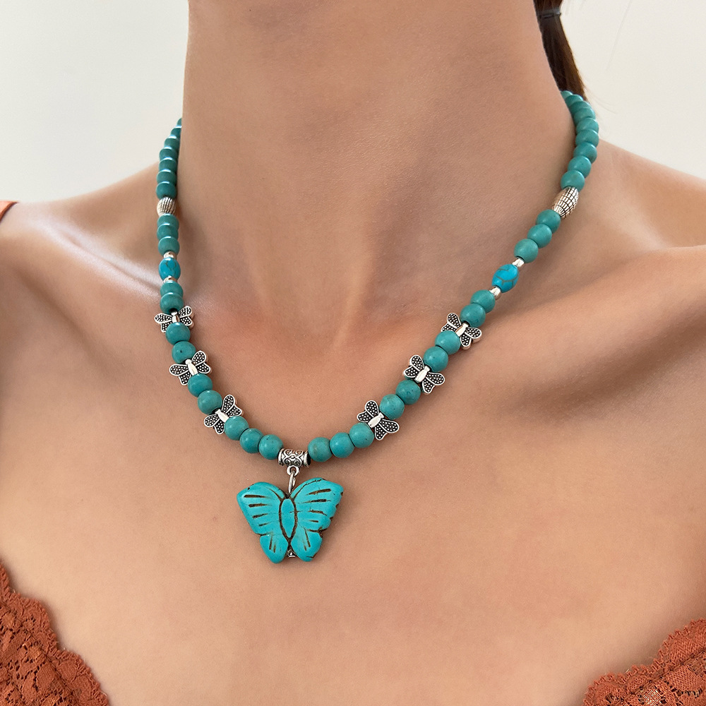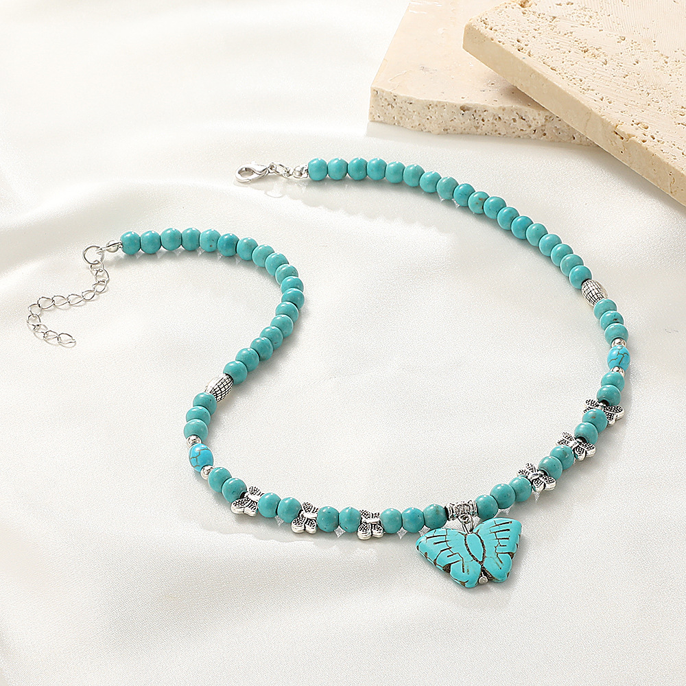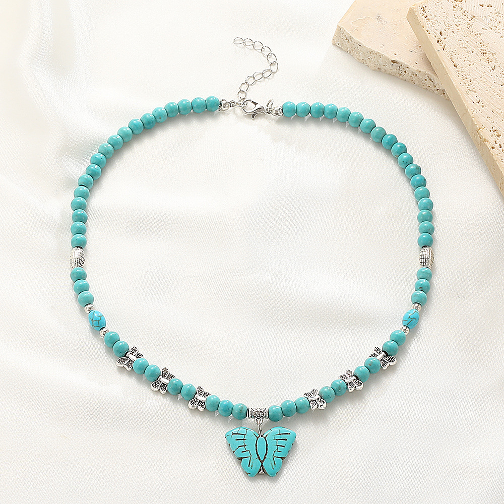Crafted from alloy with a refined electroplated finish, this necklace features smooth turquoise-toned beads accented by delicate butterfly details. The butterfly pendant adds a symbolic touch of transformation and lightness, while the beaded chain creates a balanced blend of ethnic inspiration and modern minimalism.
